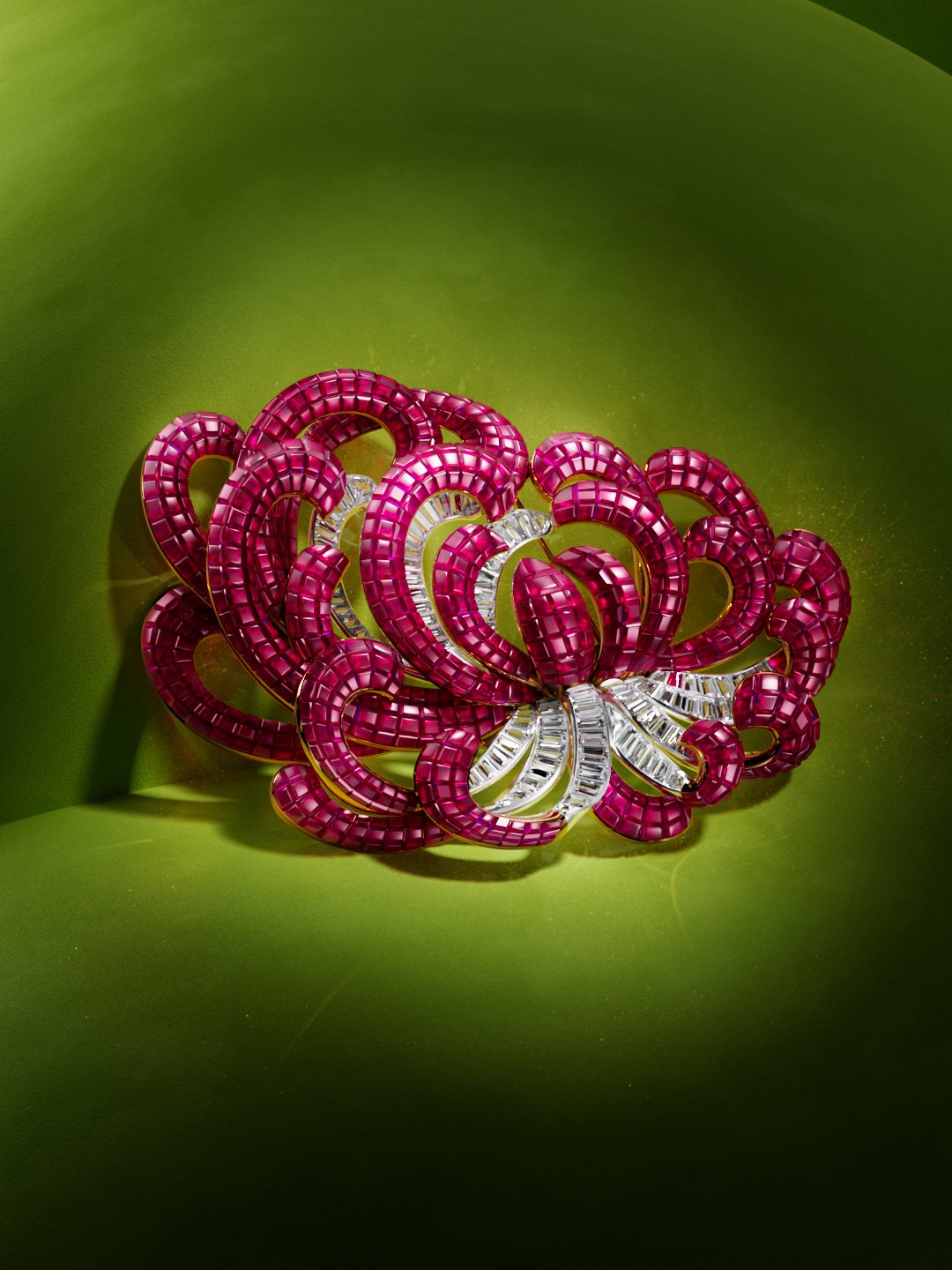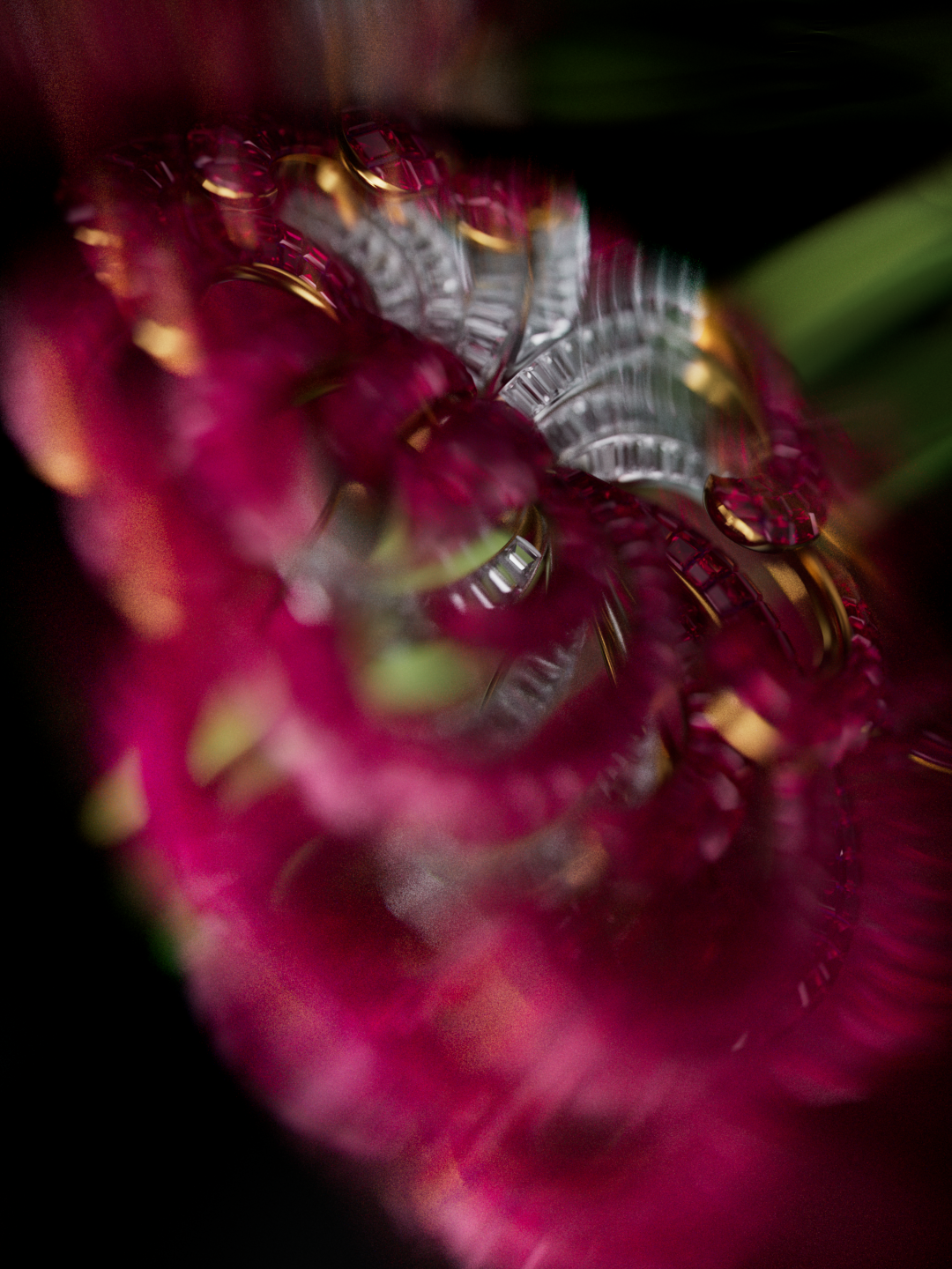 The gemstones behave almost like architectural elements, guiding the eye through a continuous flow of light.
